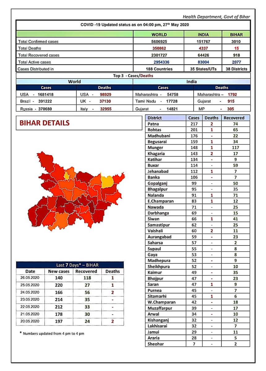 Bihar Health Dept On Twitter Biharfightscorona District Wise Cases In Bihar As Of 04 Pm On 27 5 2020 3010 Covidー19 Ve Till Date Stay Safe And Please Follow The Lockdown Biharhealthdept Https T Co 0b6yaq0gpn