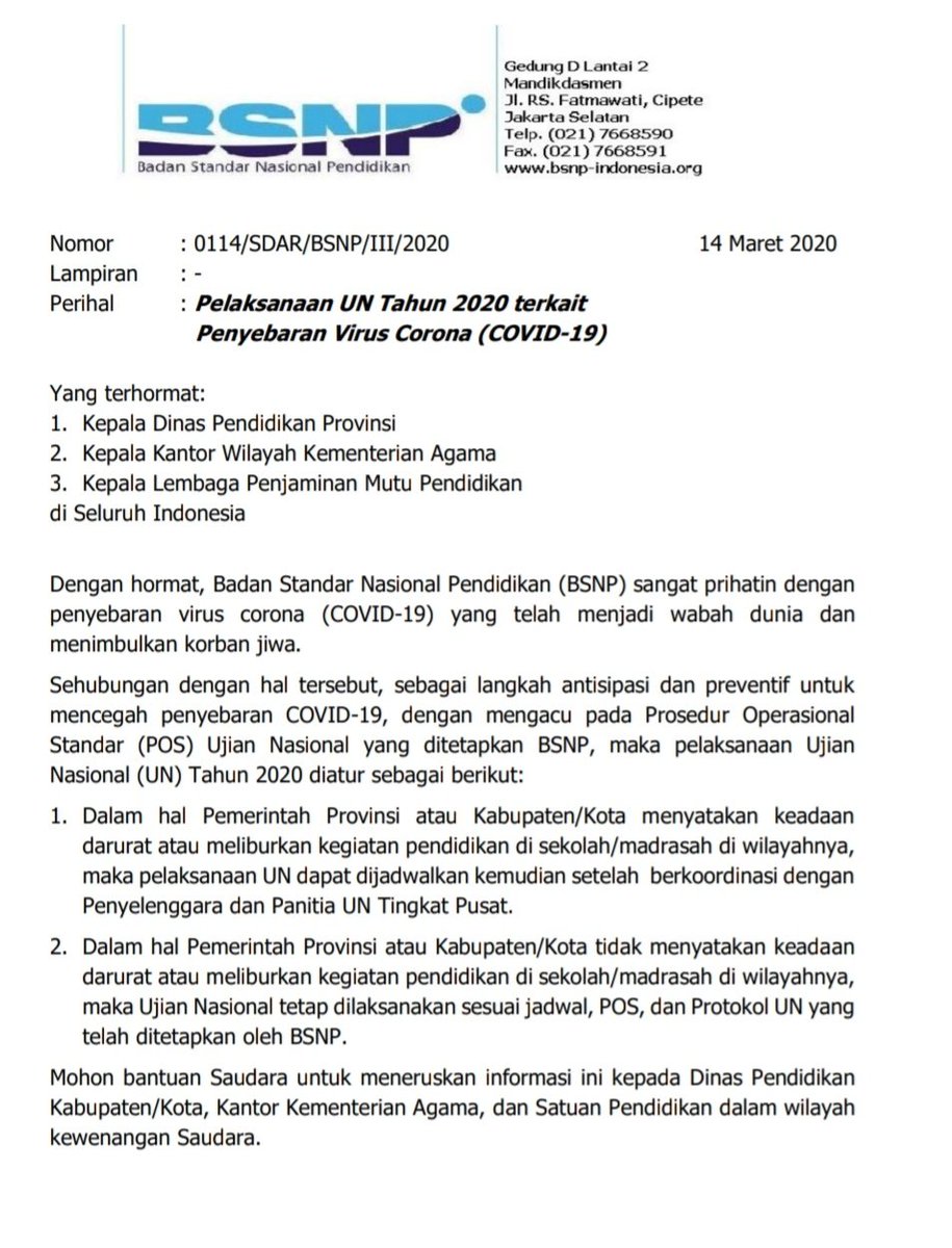 Balitbang Kemdikbud On Twitter Terbaru Bsnp Merilis Surat Edaran No 0114 Sdar Bsnp Iii 2020 Yang Berisi Tentang Pengaturan Un 2020 Terkait Dengan Perkembangan Penyebaran Covid 19 Https T Co Auxxk02j37